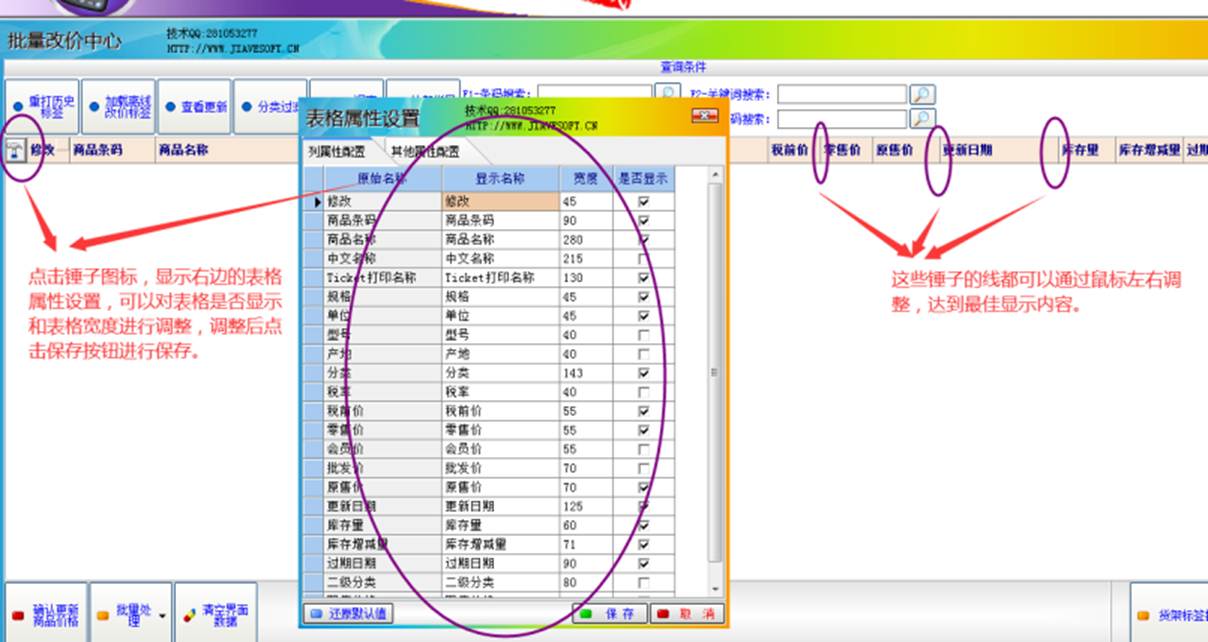 如果做了表格格式初始化,还是不满意表格显示,可以进行微调,可以调整的地方,最左边都有一个锤子图标,可以进行表格的宽度和是否允许显示的保存: