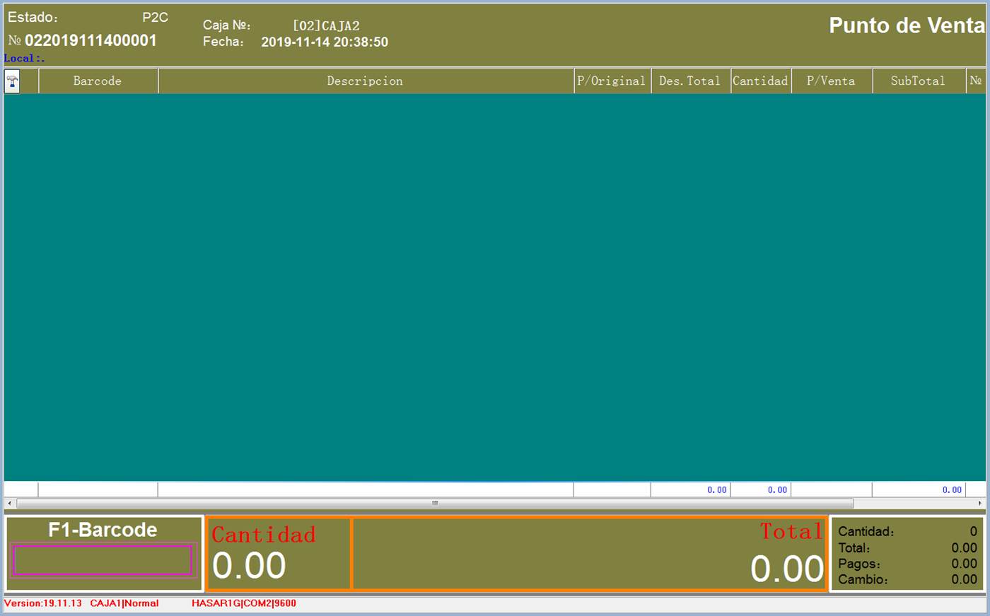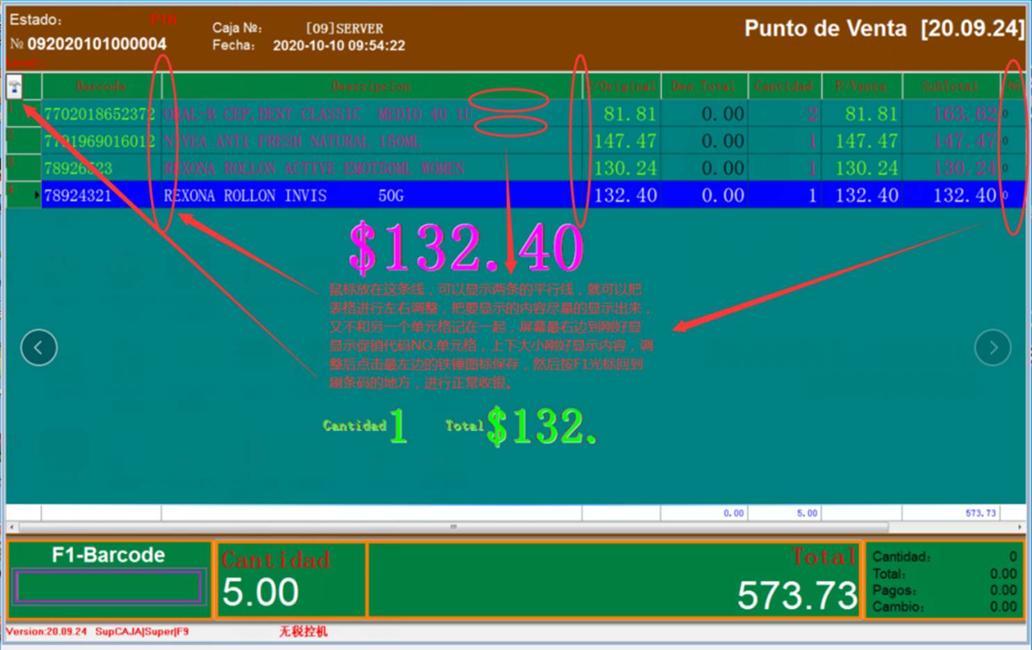 鼠标放在垂直线,出现两条平行线,可以左右调整单元格宽度,放在水平线,出现两条平行线,可以上下调整单元格的高度,调整准则是:显示最右边显示到促销代码NO.处满屏显示,售价和折扣要能显示9999.99的宽度,数量要能显示1000的宽度,合计要能显示99999.99的宽度,条码要能显示13位条码,剩下宽度都给商品名。调整好了以后点击左边的铁锤图标保存,再按一下F1,把光标定位到刷条码的地方。