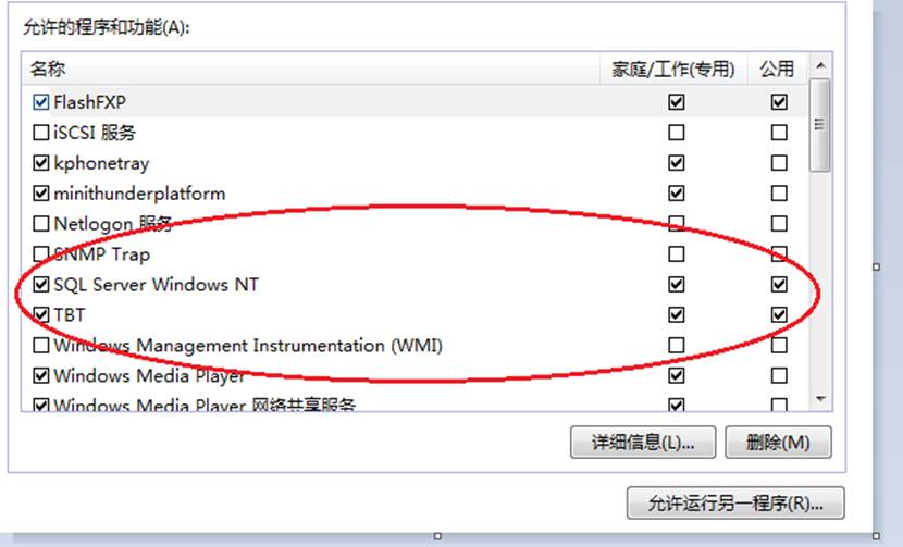 (2)如果确实要打开防火墙,点击允许程序或功能通过WINDOWS防火墙,点击允许运行另一个程序,点击浏览,把D:\ESPSA下的TBT.EXE和D:\ESpsa\SQL2000\Binn下的sqlservr.exe这两个程序都允许例外,即让它通过防火墙: