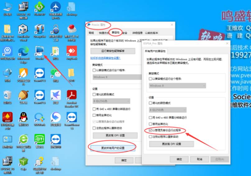 10:分别对桌面上的PRICIO图标、CAJA图标、鸣盛系统服务中心图标和数据库升级工具图标进行以管理员身份运行程序设定