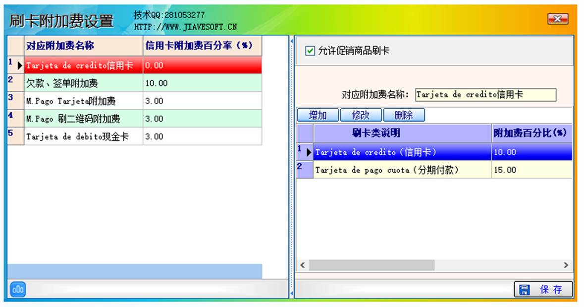 现金卡附加费设置增收3%,信用卡附加费设置增收10%,分期付款附加费设置增收15%,可根据实际情况进行修改,并且可以点击增加按钮,增加其他卡类的增收设置,注意:刷卡类说明会显示在CAJA界面上供收银员选择。