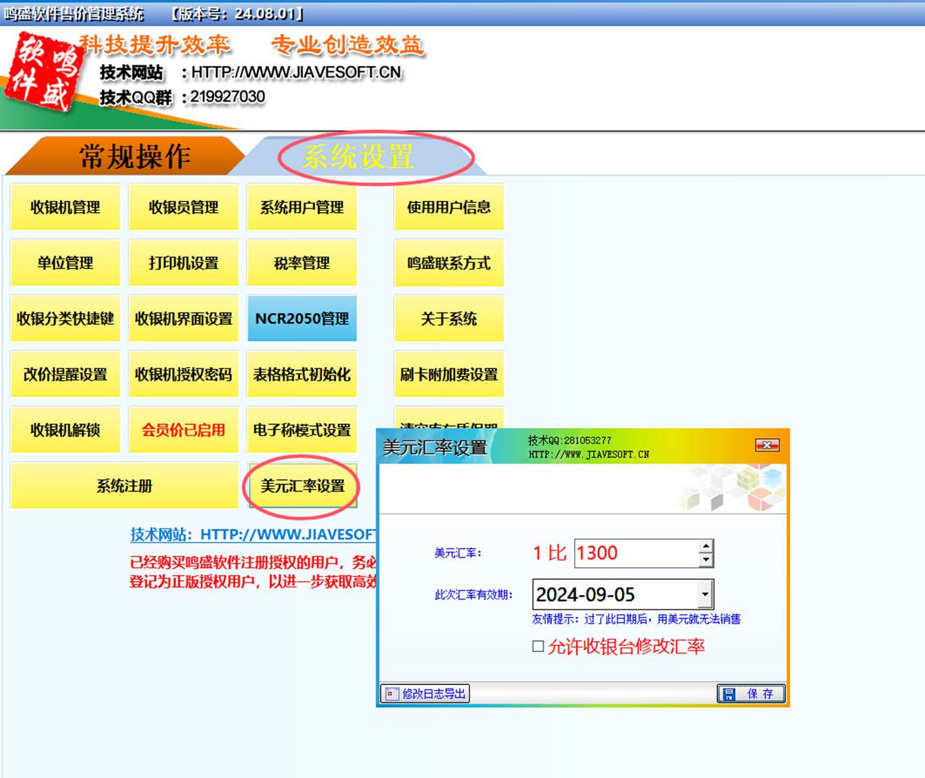 3:美元汇率设置及支付功能的实现,在改价程序里-系统设置-美元汇率设置,设定当日美元汇率、汇率有效日期及是否允许收银台修改汇率: