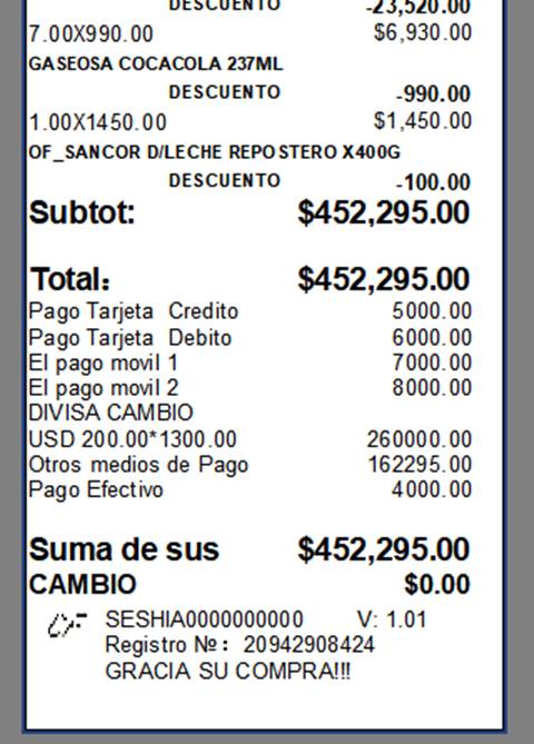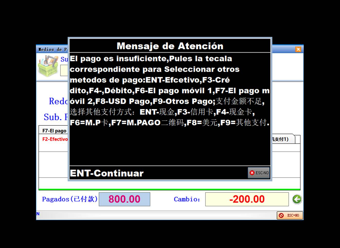2:先付现金,后付刷卡(可以刷多次的卡或刷卡+手机支付),在现金里输入要付的现金,方式参阅第一条,比如共352.75,两次付现金50+83合计付了133元,不足部分刷卡,则根据需要按F3、F4、F6、F7,程序会根据需要算出该刷卡的金额,一直到刷卡付款完成,注意,进入刷卡后的刷卡金额不能高于Pagos Total显示的金额,否则会有提示,因为刷卡是不找零的。