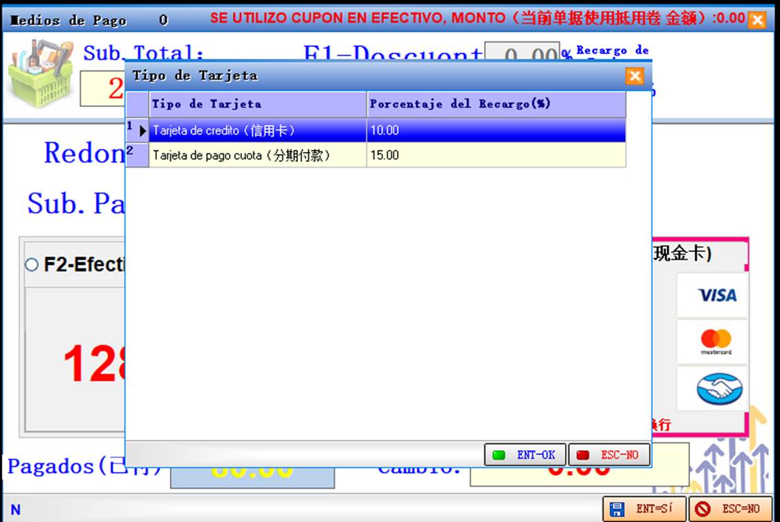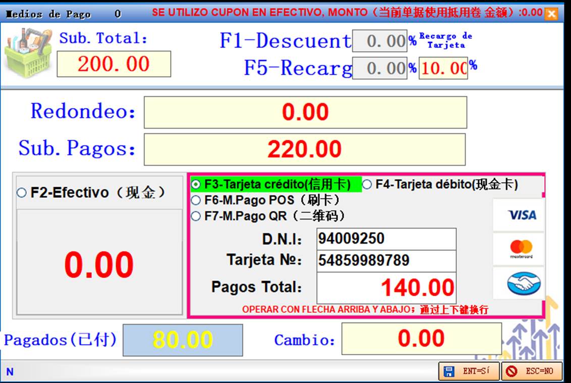 Recargo de Tarjeta:如果没有选择F1手动折扣和F5进行手动附加费,则会根据后台设定部分分别对刷卡,欠款和Mercado pago进行自动读取附加费率,如刷信用卡付款则按F3选择信用卡还是分期付款,自动读取设定的刷卡附加率,如果刷现金卡则按F4自动读取设定的刷卡附加率,按F6则会自动读取M.P 刷卡的附加率,按F7则会自动读取设定的刷二维码附加率。